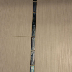 Linear porcelain tile and blue glass accent with Wenge vanity with blue crystal knobs.
