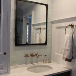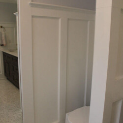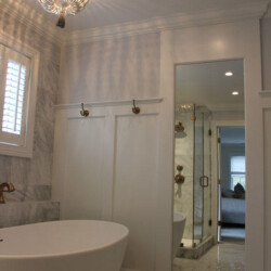 Quartzite wall tile, oval marble mosaic floor, Solid surface Bowl Tub, champagne bronze fixtures and hardware with shaker Wainscot paneling featuring a built in mirror.