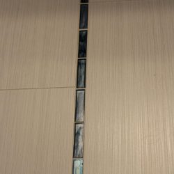 Linear porcelain tile and blue glass accent with Wenge vanity with blue crystal knobs.