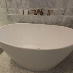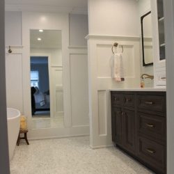Quartzite wall tile, oval marble mosaic floor, Solid surface Bowl Tub, champagne bronze fixtures and hardware with shaker Wainscot paneling featuring a built in mirror.